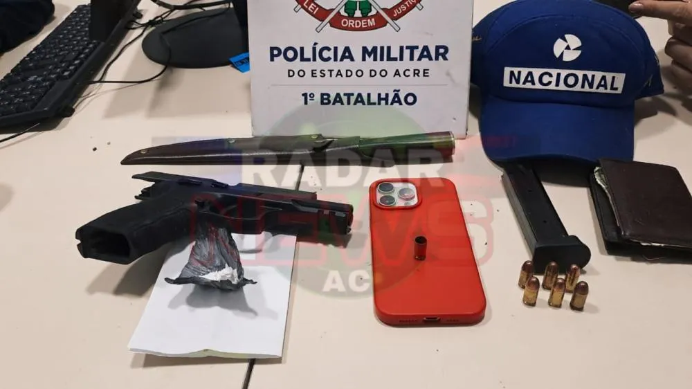 Durante a revista no interior do automóvel, os policiais encontraram uma pistola calibre .380 com seis munições — uma delas deflagrada — e uma trouxinha de cocaína.